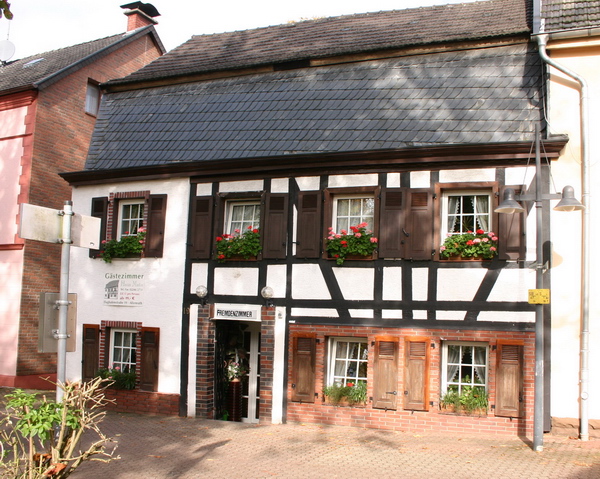 historisches Fachwerk nicht sichtbar, Fassade verputzt bzw. mit vorgesetzten Hölzern verkleidet, teilweise aufgemalte Balken