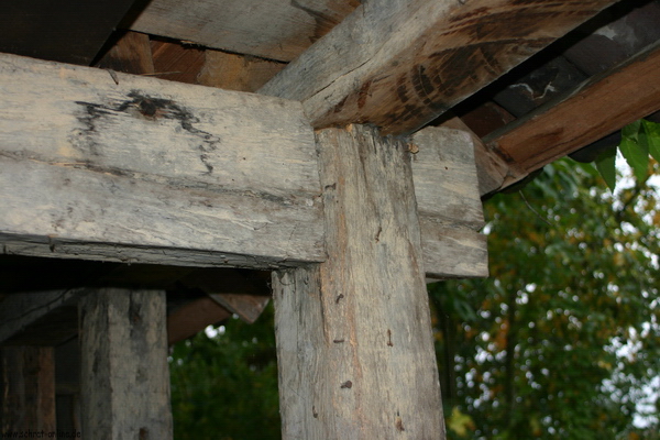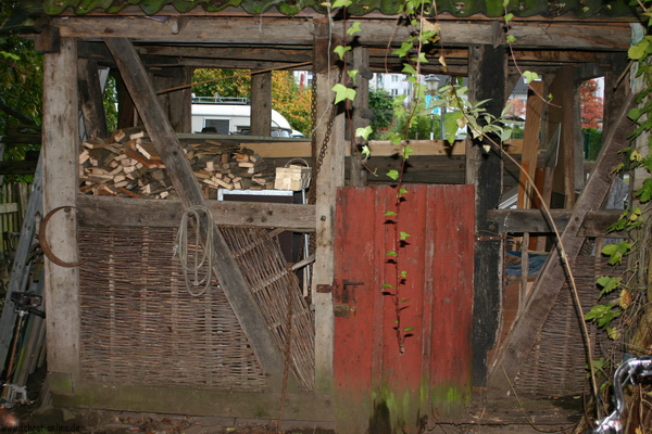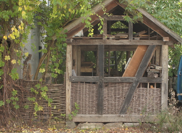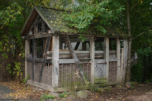 kleines Lagerhaus, aus historischen Eichenbalken neu gezimmert, als Brennholzschuppen genutzt. Bruchsteinfundament.